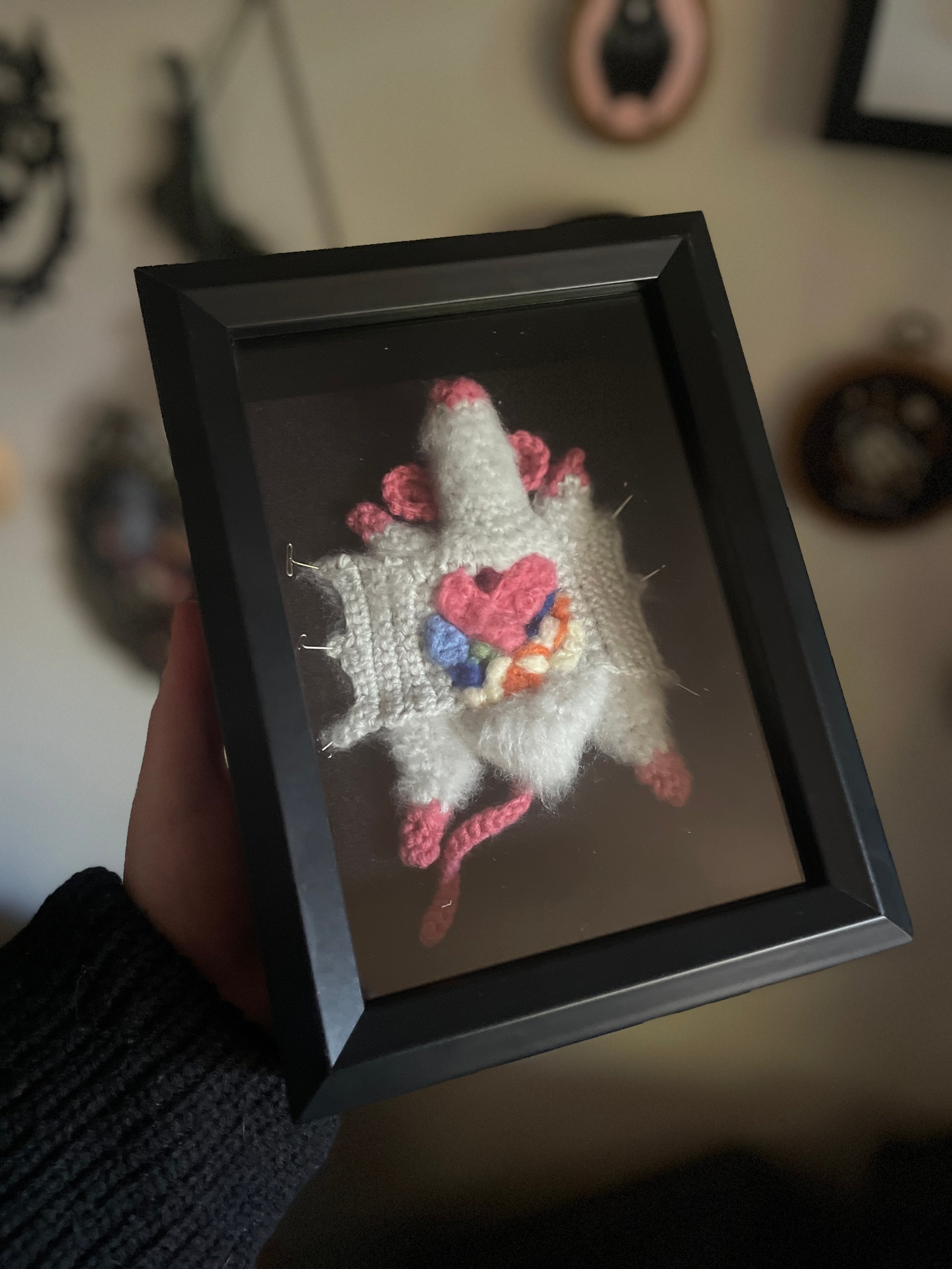 Crocheted dissected rat mounted in a 5"x7" shadowbox frame