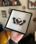 Crocheted Buck Moth in a 6"x6" shadowbox frame.